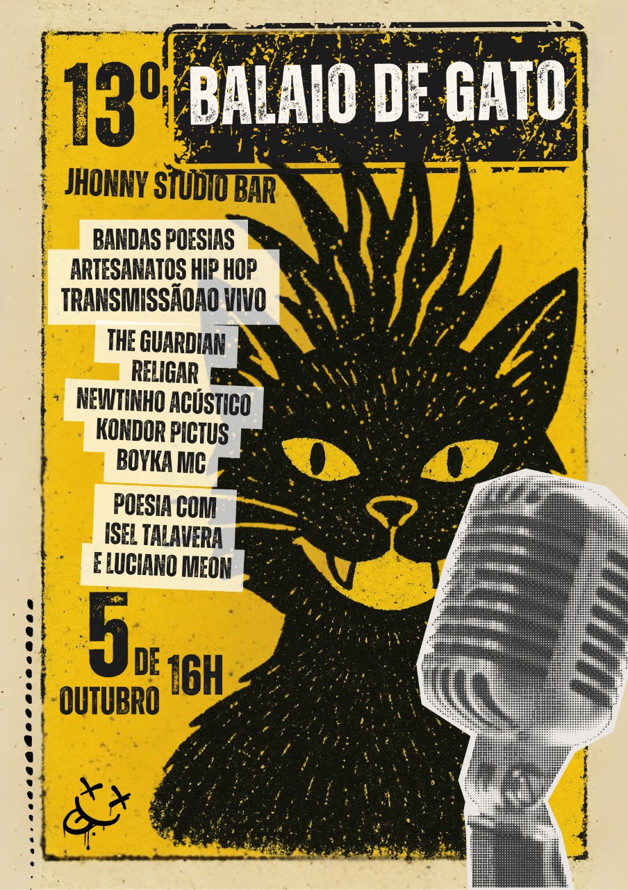 O Balaio de Gato chega à sua 13ª edição trazendo uma tarde de muita música, poesia e arte em Foz do Iguaçu. O encontro cultural acontece no dia 5 de outubro de 2025 (domingo), a partir das 16h, no Jhonny Studio Bar, com entrada gratuita.