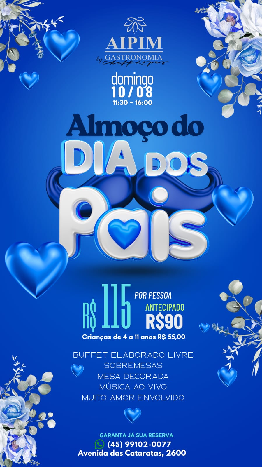 Para tornar o Dia dos Pais inesquecível, o Aipim Gastronomia by Chef Lopes promove no domingo, 10 de agosto, um almoço festivo repleto de sabores, música e carinho. O evento acontece das 11h30 às 16h, em um ambiente aconchegante e decorado especialmente para receber as famílias.