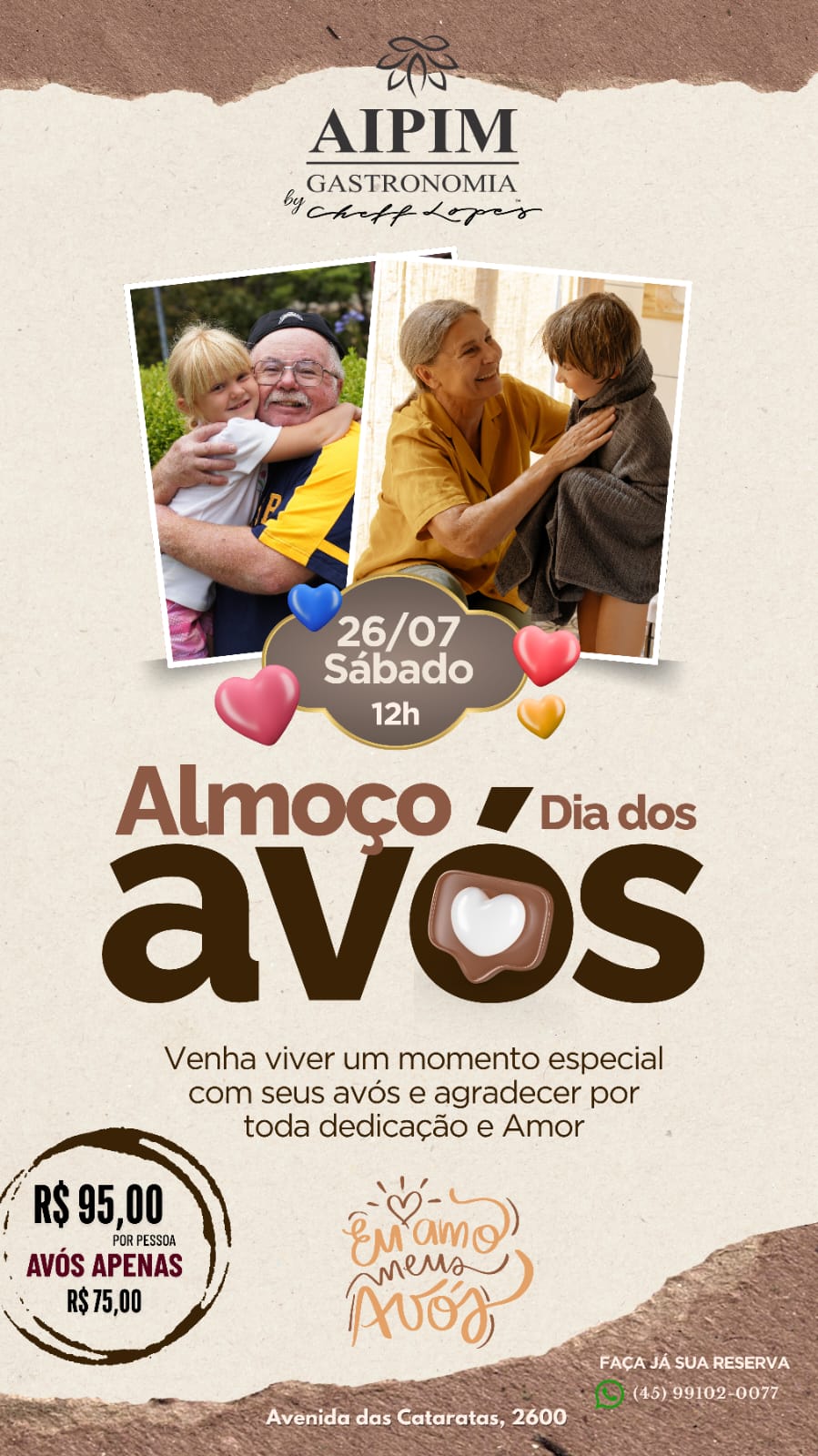 Neste sábado, 26 de julho, a partir das 12h, o Aipim Gastronomia by Cheff Lopes convida todos os netos e netas a homenagearem aqueles que são sinônimos de afeto e sabedoria: os avós. Em comemoração ao Dia dos Avós, o restaurante promoverá um almoço especial, pensado com muito carinho para celebrar essa data tão significativa.