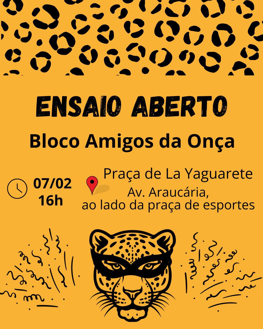 O ensaio aberto do Bloco Amigos da Onça será realizado das 16h às 18h, na Praça de las Yaguaretés, na Avenida Araucária, ao lado da quadra esportiva.