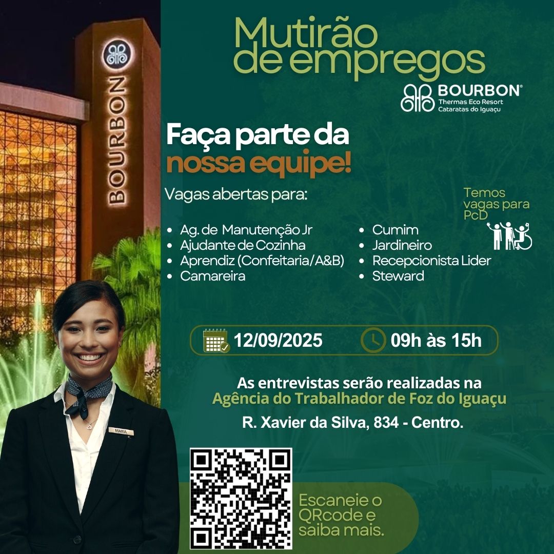 O Bourbon Thermas Eco Resort Cataratas do Iguaçu promove nesta sexta-feira (12), em parceria com a Agência do Trabalhador de Foz do Iguaçu, um Mutirão de Empregos com mais de 30 oportunidades de contratação imediata.