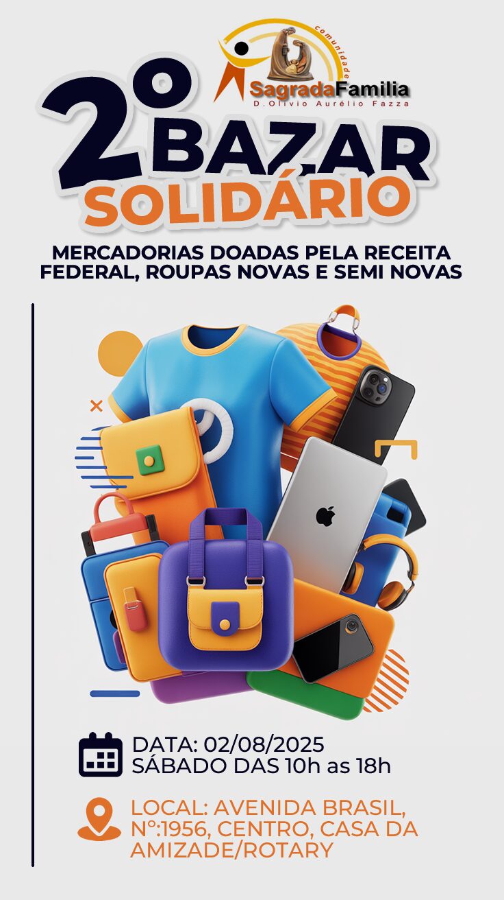 A Comunidade Sagrada Família D. Olívio Aurélio Fazza realiza no próximo dia 2 de agosto, sábado, das 10h às 18h, o 2º Bazar Solidário, com mercadorias doadas pela Receita Federal e uma variedade de roupas novas e seminovas. O evento acontecerá na Casa da Amizade/Rotary, localizada na Avenida Brasil, nº 1956, Centro de Foz do Iguaçu.