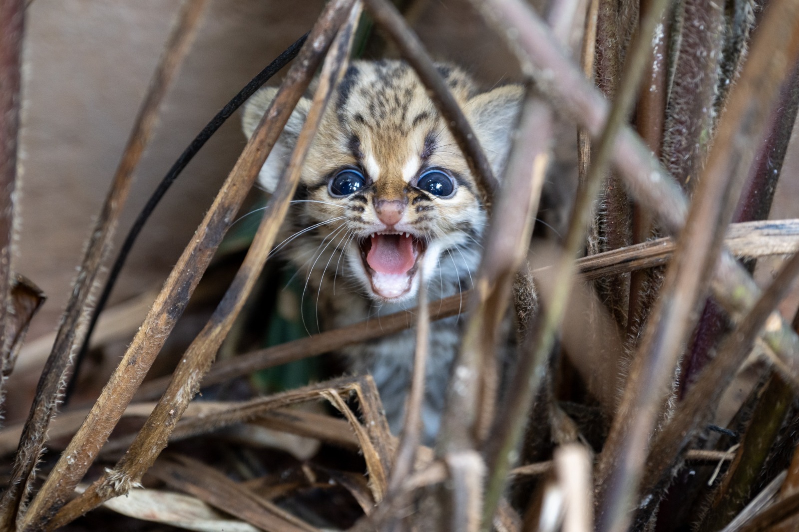 O pequeno gato-maracajá nasceu em 9 de maio, fruto da reprodução entre um macho resgatado da natureza pelo Parque Ecológico da Klabin, localizado em Telêmaco Borba (PR), e uma fêmea que já vivia no RBV. Aline destaca que essa união enriquece a diversidade genética do filhote e amplia as possibilidades de, futuramente, participar de projetos de reintrodução na natureza.