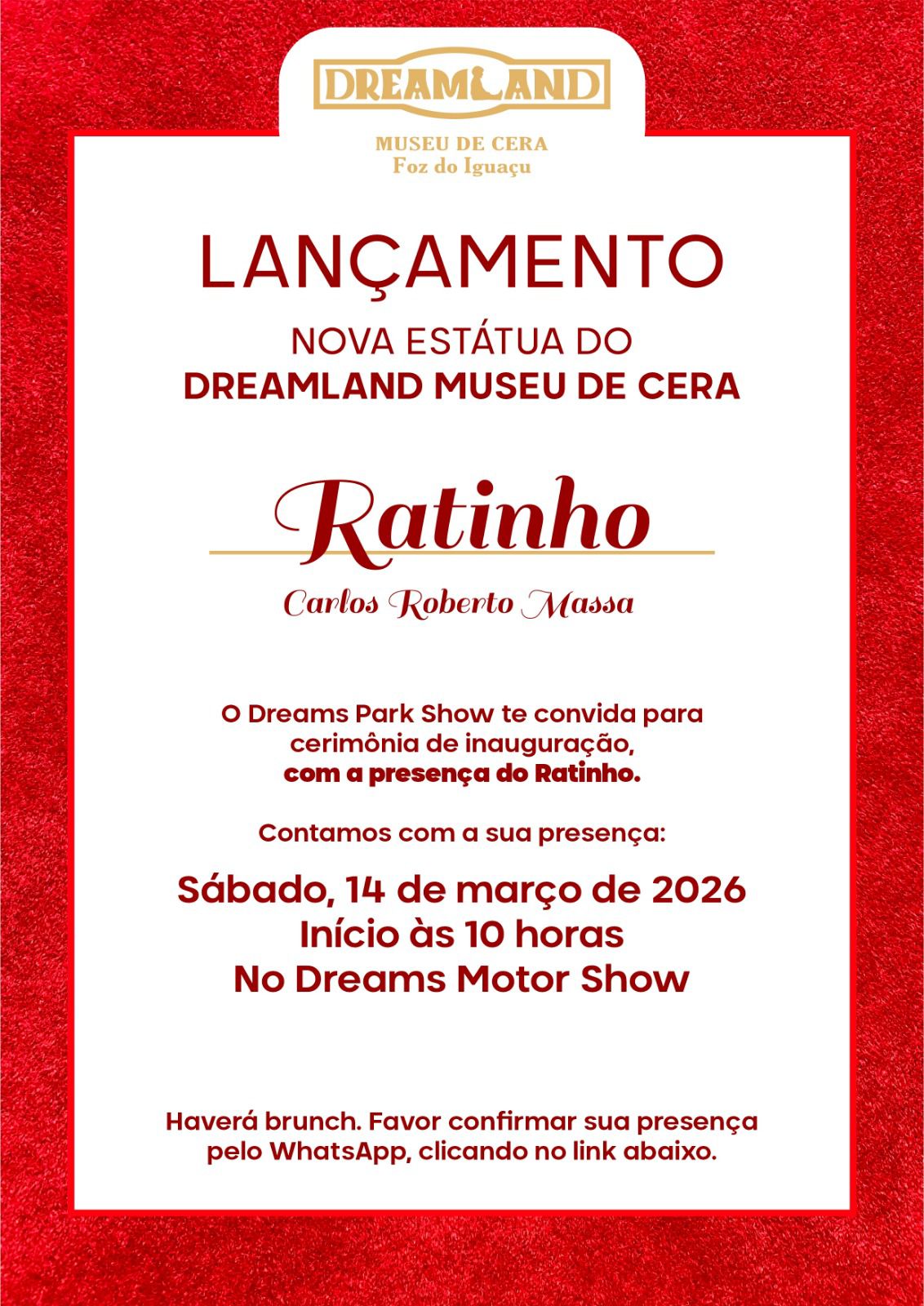 A nova estátua do Dreamland terá a figura do consagrado apresentador Carlos Roberto Massa, popularmente conhecido como Ratinho. A escolha celebra a trajetória e a influência do comunicador, reconhecido nacionalmente por seus programas de televisão.
