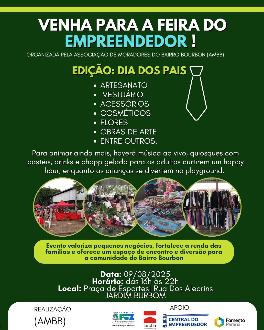 A feira tem o apoio da Tarobá Construções e já confirmou a próxima edição para 2026, na véspera do Dia das Mães, reforçando o vínculo com datas comemorativas e a convivência comunitária.