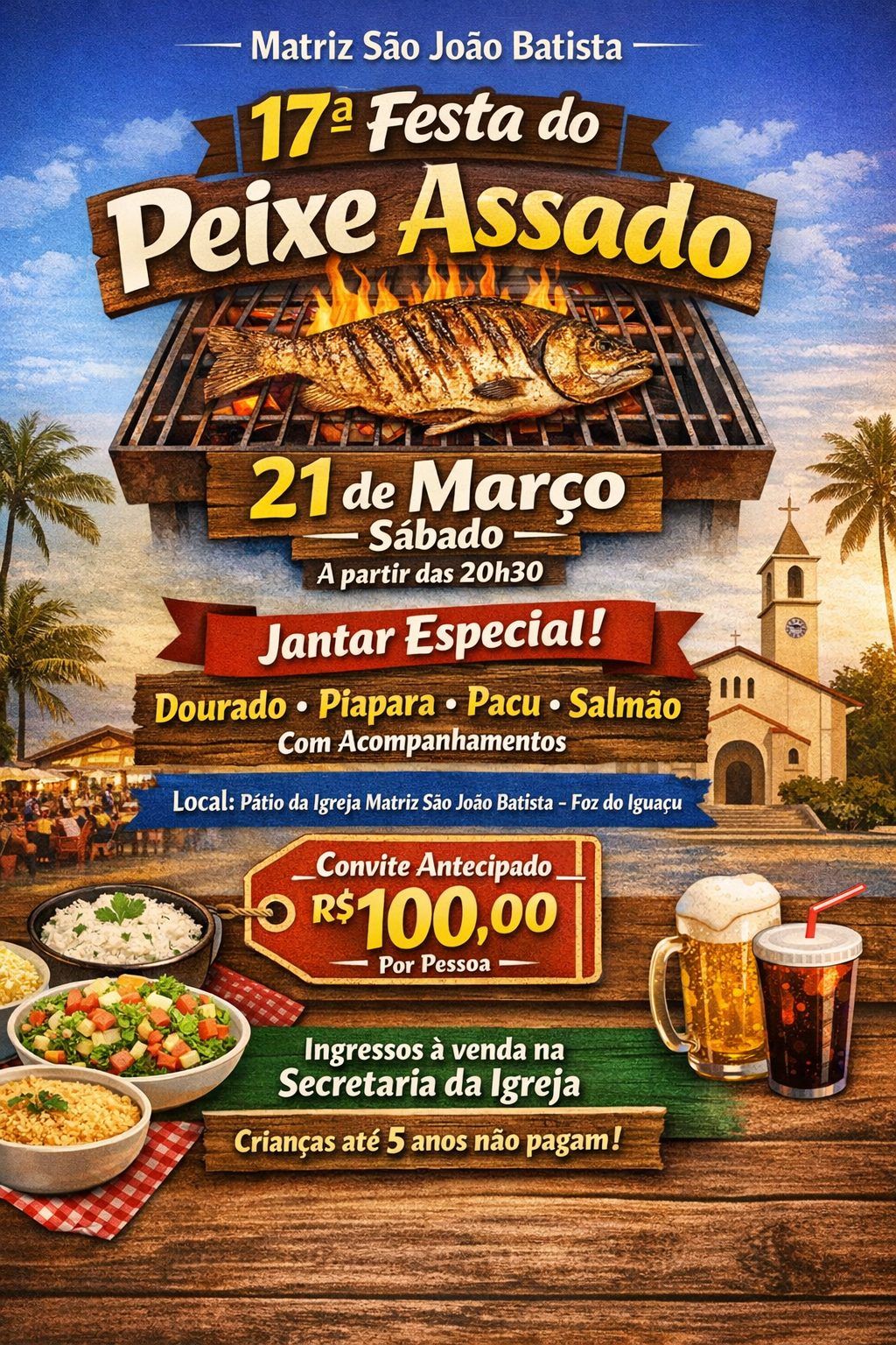 Uma das festas gastronômicas mais tradicionais de Foz do Iguaçu já tem data confirmada. A 17ª Festa do Peixe Assado da Matriz São João Batista será realizada no dia 21 de março, um sábado, a partir das 20h30, no pátio da igreja.