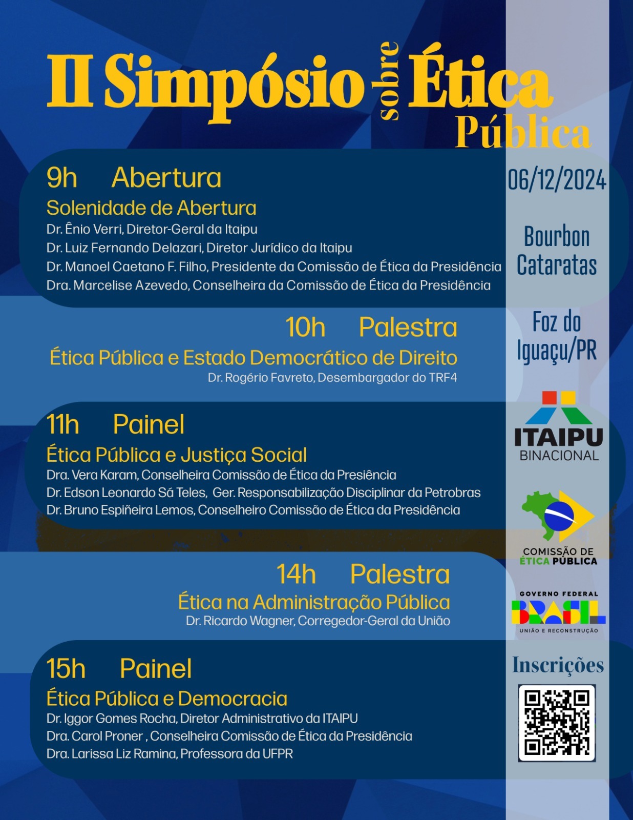 Às 15h, o painel “Ética Pública e Democracia” trará contribuições do diretor administrativo da Itaipu, Iggor Gomes Rocha; da conselheira da Comissão de Ética da Presidência, Carol Proner; e da professora da UFPR, Larissa Liz Ramina.