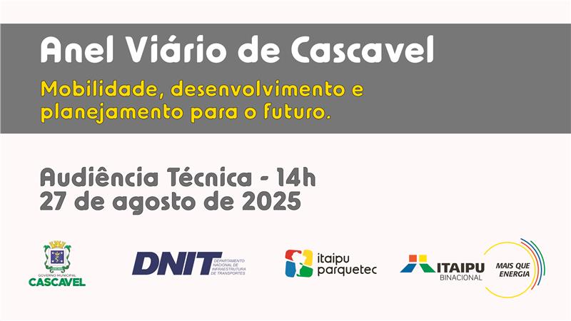 O Itaipu Parquetec, em convênio com a Itaipu Binacional, realiza no dia 27 de agosto, às 14h, uma audiência técnica online para apresentar o Termo de Demanda do Estudo de Viabilidade Técnica, Econômica e Ambiental (EVTEA) do Anel Viário de Cascavel. A transmissão será ao vivo pelo link: youtube.com/live/cN294z-qXn4.