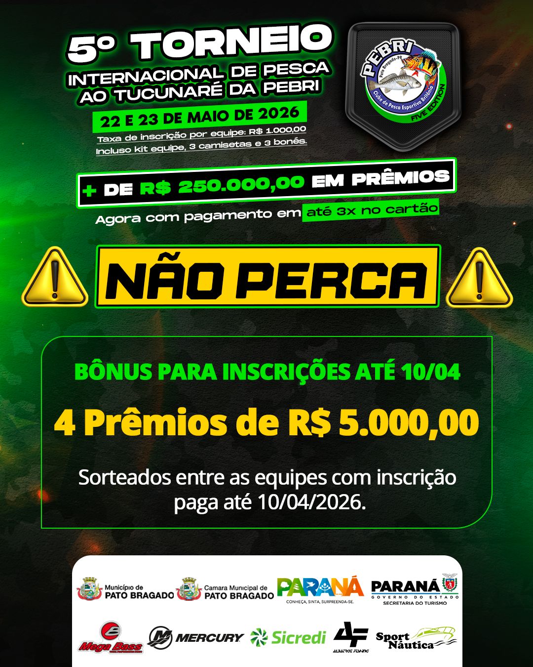 Os amantes da pesca esportiva já podem se preparar para um dos maiores eventos do setor no Paraná. Nos dias 22 e 23 de maio de 2026, o Clube de Pesca Esportiva Britânia (PEBRI) realiza a quinta edição do Torneio Internacional de Pesca ao Tucunaré.