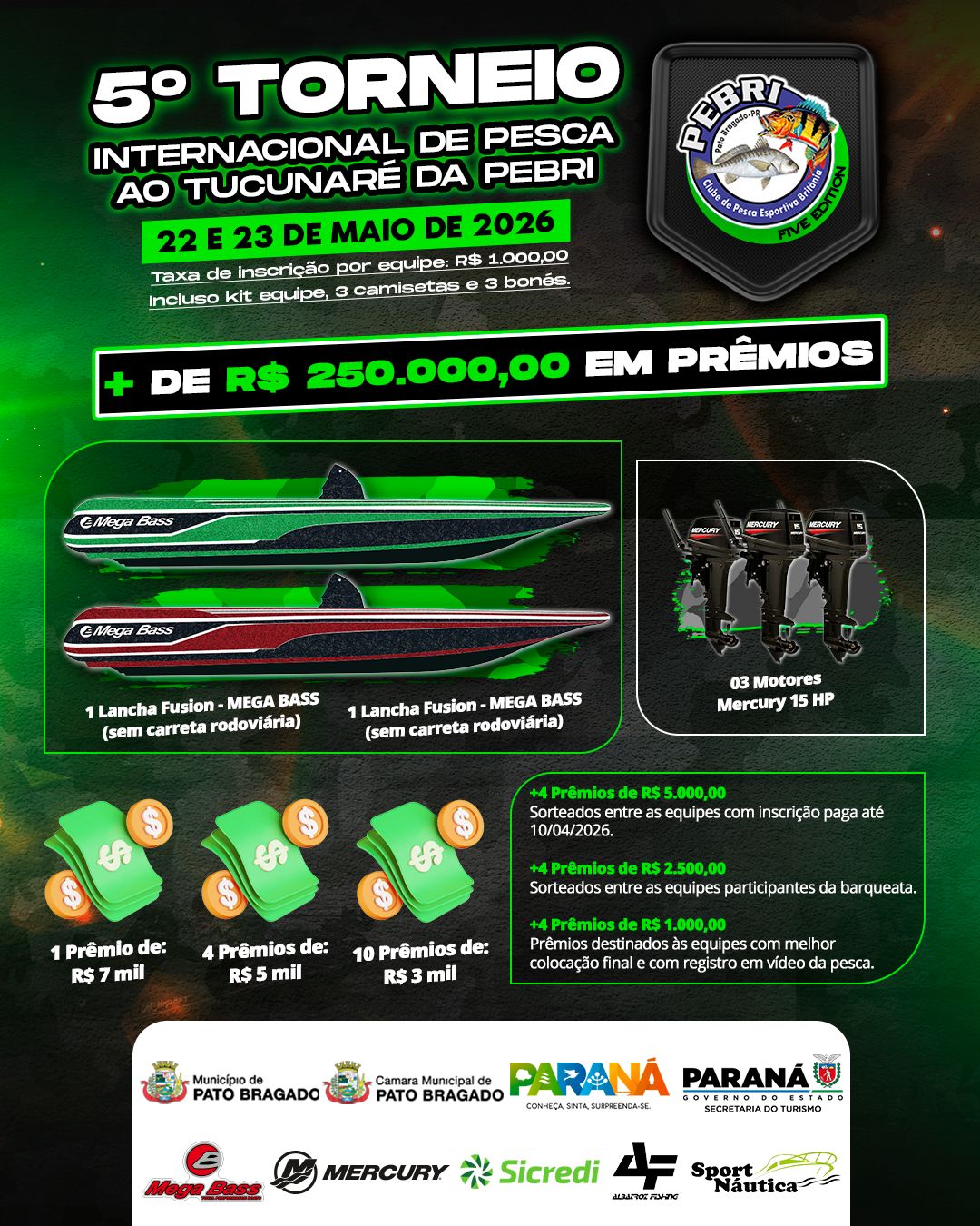 O grande atrativo desta quinta edição é o montante que ultrapassa a marca de R$ 250 mil em prêmios. Entre os itens de maior destaque estão duas lanchas modelo Fusion da marca Mega Bass, que serão entregues sem a carreta rodoviária, e três motores Mercury de 15 HP.