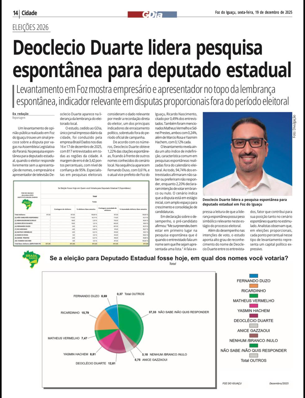 Uma nova pesquisa de opinião pública, divulgada pelo jornal GDia, traz um cenário promissor para o empresário e apresentador Deoclecio Duarte. O levantamento, realizado pelo Instituto Brasil Dados, aponta Deoclecio na liderança da pesquisa espontânea para o cargo de deputado estadual em Foz do Iguaçu.