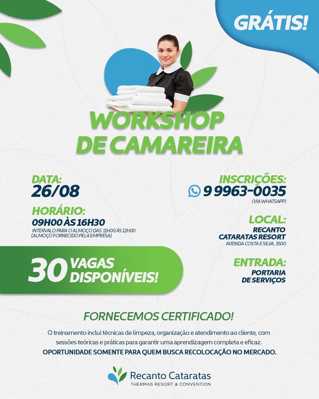 O Recanto Cataratas Thermas Resort & Convention, em Foz do Iguaçu, promove no dia 28 de agosto, das 9h às 16h30, um workshop gratuito de camareiras, voltado a mulheres que estejam fora do mercado de trabalho e busquem qualificação profissional no setor hoteleiro.