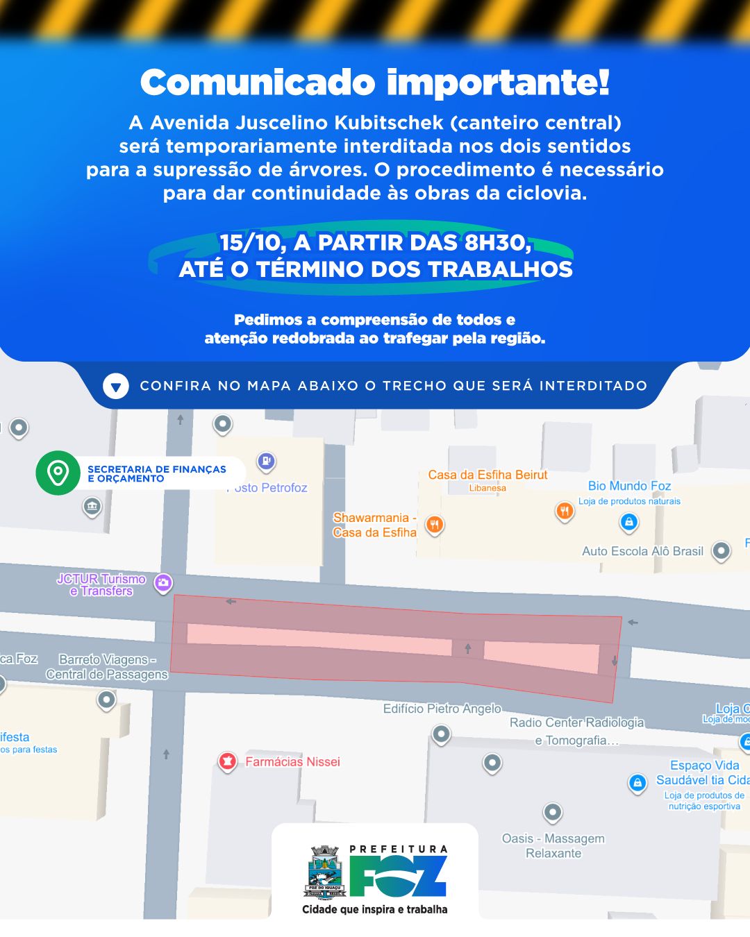 A Secretaria Municipal de Meio Ambiente de Foz do Iguaçu informa que nesta quarta-feira (15) será realizada a supressão de árvores no canteiro central da Avenida Juscelino Kubitschek, entre as ruas Bartolomeu de Gusmão e Rui Barbosa. A intervenção faz parte da execução da ciclovia prevista no projeto de revitalização da Avenida JK.